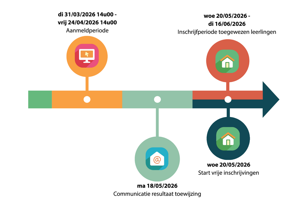Je kind aanmelden voor schooljaar 2026-2027 kan tussen 31 maart 2026 (14.00 u.) en 24 april 2026 (14.00 u.). Noteer alvast onderstaande data in je agenda.